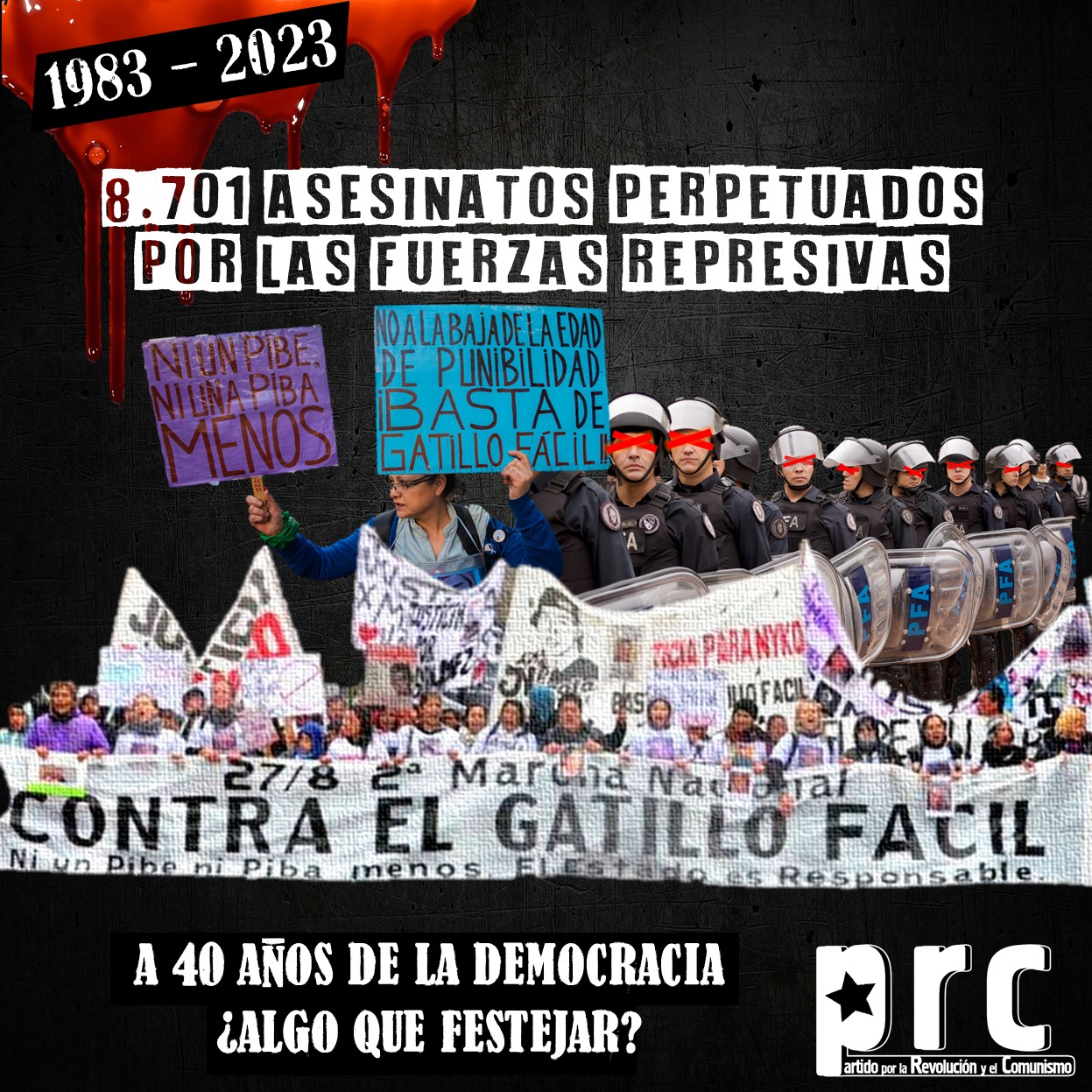 A 40 años de la vuelta a la democracia, resulta urgente que luchemos con las banderas de lxs 30.400 detenidxs, desaparecidxs y asesinadxs por la dictadura militar para acabar ya con este régimen opresor y represor.
