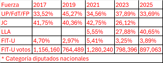 De la misma forma analizamos que en la actual coyuntura de polarización y de crisis del régimen, los votos conseguidos por el FITU son un apoyo explícito a esta orientación de lucha y resistencia. Por eso no es menor el 3er lugar obtenido en dos de los principales distritos electorales del país (provincia de Buenos Aires y CABA). Sin embargo, los resultados del FITU que vimos se han estancado entre 2017 y 2023, en este 2025 ha retrocedido casi 400 mil votos respecto a 2021. La cosecha de tres diputados implica que se ha perdido uno. Esto, desde luego, habla de una elección que no fue buena en términos de cantidad de votos.